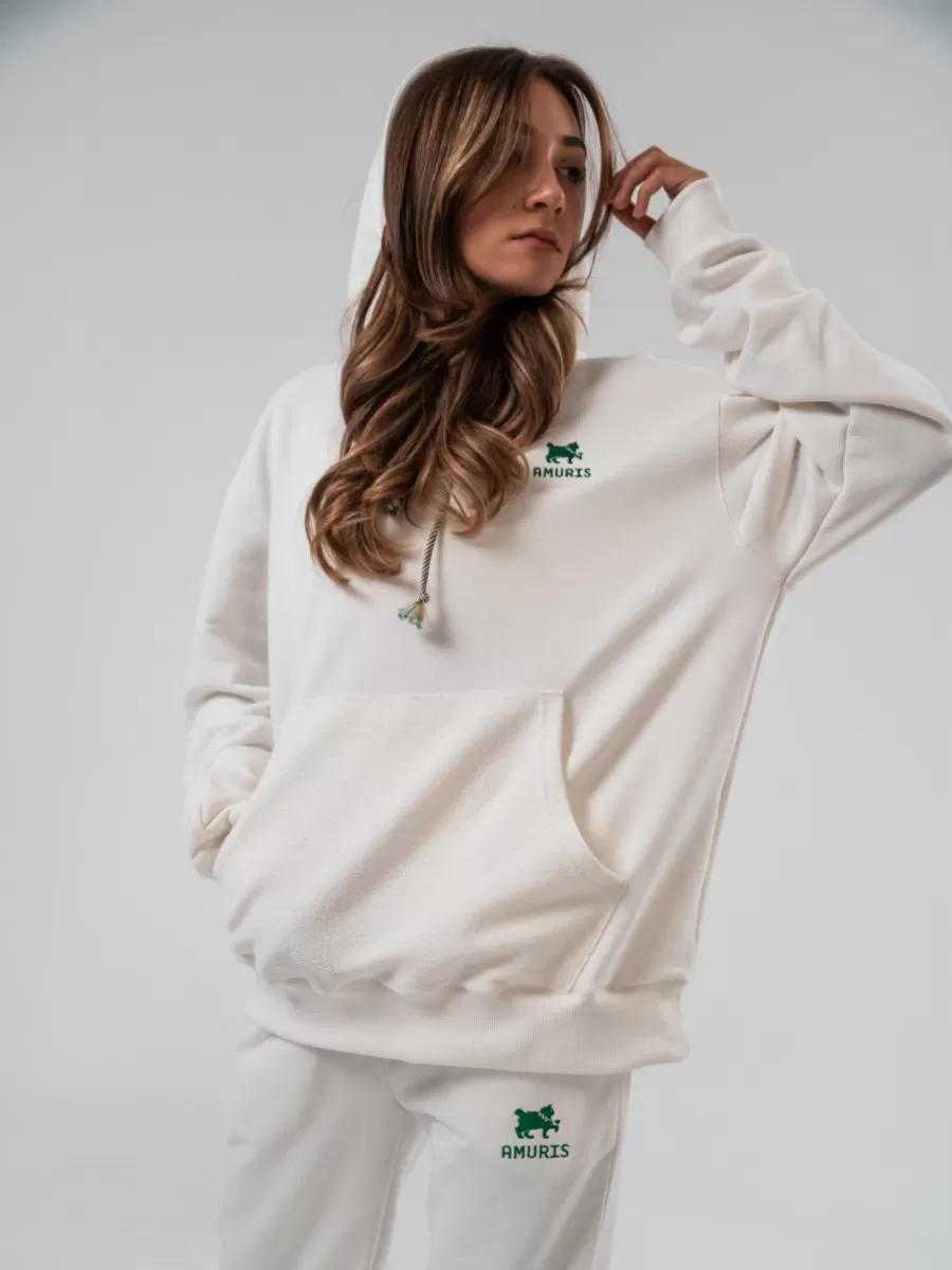 Худи с капюшоном, большим карманом впереди из комбинированной мягкой ткани, эффектный логотип в качестве вышивки фирменного значка с надписью AMURIS ярко-зеленого цвета, приятный на ощупь.